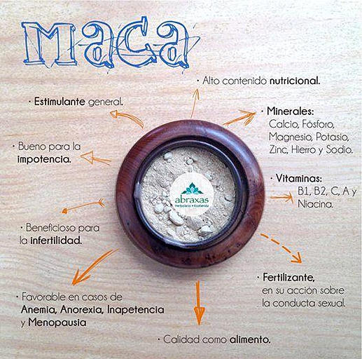 - Propiedades afrodisíacas, estimulantes y para la fertilidad: fue usada para estas tres finalidades desde hace siglos, la maca era considerada “mágica” y usada en los rituales sagrados para obtener prosperidad en los pueblos. Se la conoce popularmente como el “viagra peruano”, se usa para tratar la impotencia sexual, aumentar la fertilidad, remediar la falta de libido (o deseo sexual) y la disfunción eréctil.Esto se debe a uno de sus componentes principales, la macamida. Ésta actúa en el hipotálamo y las glándulas suprarrenales, por lo que regula los niveles hormonales y tiene un efecto energético. A su vez, aumenta el flujo sanguíneo en la zona pélvica, estimulando la potencia sexual. Estudios actuales confirman que aumentan la fertilidad tanto en hombres como en mujeres, mejora la producción y motilidad del esperma, aún en alturas elevadas y también sirve para prevenir la hiperplasia de la próstata.
